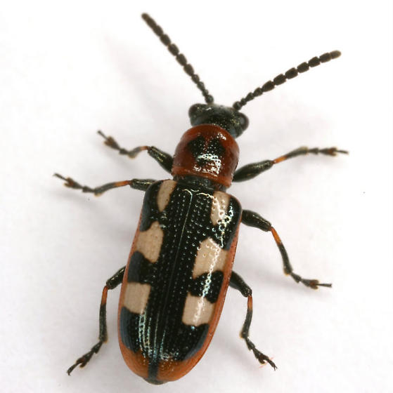 Descriere. Adultul are o lungime de aproximativ 6 – 8 mm., fiind colorat diferit. Acesta are elitrele de culoare galben – palid, marginile rosii cu o dunga comuna de culoare albastru – metalic, taiata de doua benzi transversale de aceiasi culoare. Larva aflata la ultima are o lungime de 6 – 8 mm., usor bombata de culoare cenusiu – deschis cu luciu galbui pe partea dorsala.