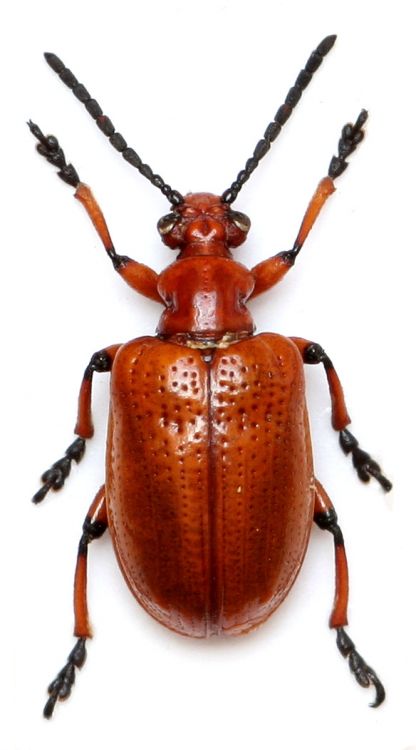 Descriere. Lungimea adultului este de 6 – 7.5 mm., de culoare portocalie. Larva are aproximativ 8 – 12 mm., de culoare galben – portocalie.